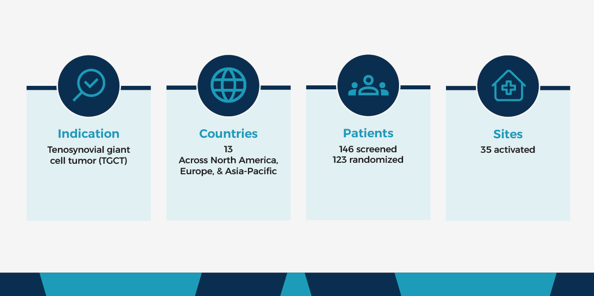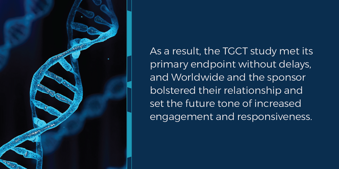 When a small biotech approached Worldwide more than nine years ago for a Phase I/II advanced malignancy study, this partnership resulted in an almost decade-long mutually beneficial collaboration. In 2023, when the sponsor’s tenosynovial giant cell tumor (TGCT) faced challenges, Worldwide’s team stepped in to foster increased collaboration and mitigate study roadblocks. Due to our team’s timely and efficient efforts, the TGCT study expects FDA and EMA approval, and Worldwide strengthened our relationship with the small biotech.