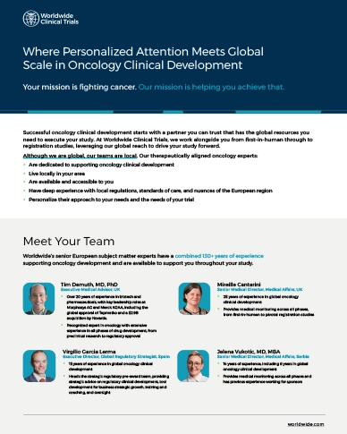 With Worldwide, you don’t have to choose between a CRO with global resources and one who can deliver personalized services. Our oncology teams are worldwide and provide the customized, hands-on approach to development that our sponsors need.