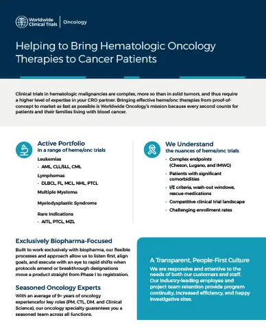 Learn how Worldwide Oncology helps biotechs advance complex hematologic oncology trials faster. With deep expertise across leukemias, lymphomas, multiple myeloma, and rare hematologic malignancies, our seasoned teams, global site network, and flexible, data‑driven approach help overcome enrollment and endpoint challenges —accelerating paths from proof‑of‑concept to market.