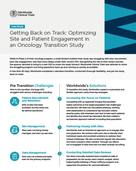 Faced with a CRO delivering slow recruitment, disengaged sites, and delayed data management in its Phase 2 oncology study, this biotech decided to pivot and bring in a new CRO. They came to Worldwide requesting the hands-on, proactive support they’d heard Worldwide could deliver. Check out this case study to see how the transition went and what the outcomes were for this study.