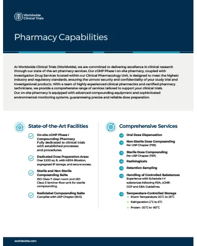 We are committed to delivering excellence in clinical research through our state-of-the-art pharmacy services. Our cGMP Phase I on-site pharmacy, coupled with Investigation Drug Services located within our Clinical Pharmacology Unit, is designed to meet the highest industry and regulatory standards, ensuring the utmost security and confidentiality of your study trial and investigational products. Learn more in our fact sheet.