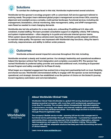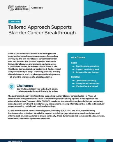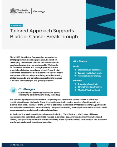 Worldwide provided flexible, full‑service support to an emerging biotech developing the first bladder cancer therapy breakthrough in decades, while simultaneously navigating shifting priorities, system gaps, and pandemic‑era challenges. By leading cross‑CRO coordination, accelerating site activation, and ensuring seamless operational continuity, Worldwide enabled the sponsor to achieve Fast Track designation and a successful IPO.