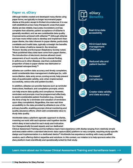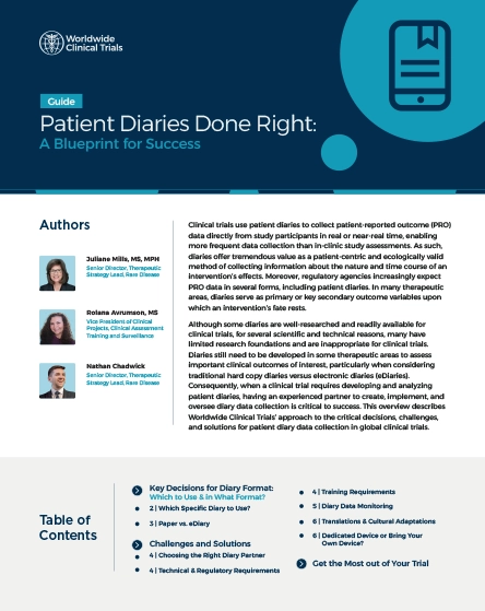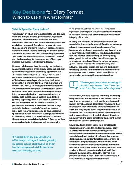 Clinical trials use patient diaries to gather patient-reported outcome (PRO) data directly from participants and provide valuable, patient-centric insights into the effects of interventions. Patient diaries are increasingly expected by regulatory agencies and serve as key outcome measures in many therapeutic areas. However, not all diaries are suitable for clinical trials. Some therapeutic areas lack adequate research foundations, requiring the development of new diaries.