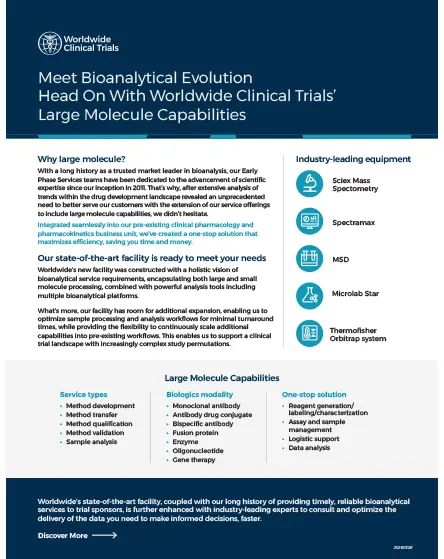 Meet bioanalytical evolution head on with Worldwide Clinical Trials’ large molecule capabilities. Integrated seamlessly into our pre-existing clinical pharmacology and pharmacokinetics business unit, we’ve created a one-stop solution that maximizes efficiency, saving you time and money. Download our fact sheet to learn more.