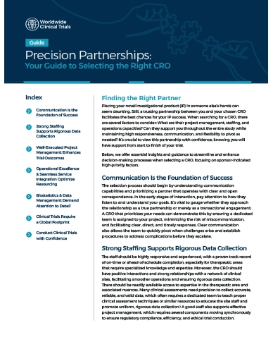 When selecting a CRO, the right partnership is essential to the success of your clinical trial. This guide, Precision Partnerships: Your Guide to Selecting the Right CRO, provides insights into the most critical factors to consider, including strong communication, experienced staff, project management excellence, operational efficiency, and global trial capabilities.