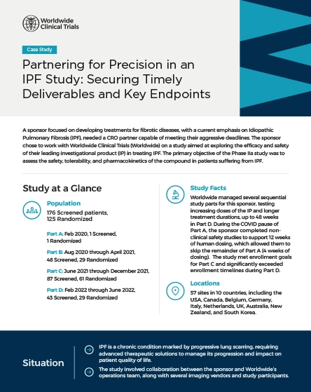 A sponsor dedicated to developing treatments for fibrotic diseases chose Worldwide Clinical Trials to overcome tight timelines and logistical challenges in their global Phase IIa IPF study. Our specialized team worked closely with the sponsor, managing complex coordination among multiple vendors and maintaining rigorous adherence to milestones.