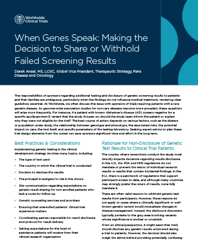If a patient does not screen positive for the targeted genetic variant when being screened for a study, is it advisable or is there any obligation for the study team to disclose the results to the patient? The answer isn’t a simple one. For best practices and considerations for including genetic testing in your clinical development strategy, read our article.