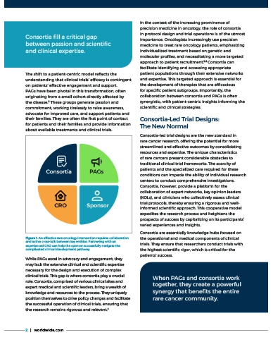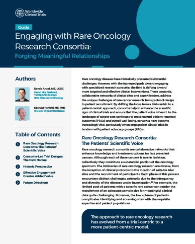 Rare oncology diseases present inherent challenges for interventional clinical trials. To enhance the quality of clinical discovery, participant experience, and overall chances for success, there is a steady increase in the role of specialized research consortia. These groups of experts, including medical doctors and scientists, ensure more targeted and effective research by working with clinical site networks and addressing the challenges specific to the rare oncology space. The focus is shifting from a trial-centric to a patient-centric approach, which enhances trial rigor and gives patients a scientific voice in tandem with patient advocacy groups (PAGs).