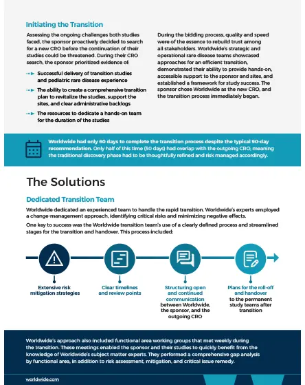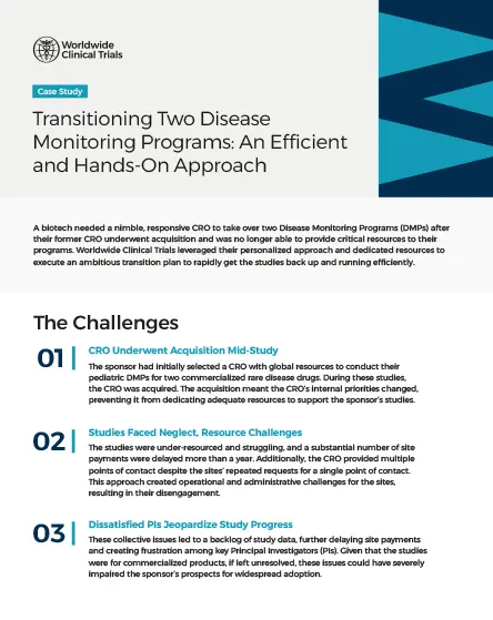 Deciding to bring in a new CRO to transition a struggling study is a difficult decision to make. Then, after selecting the CRO, the transition process can be time-consuming and challenging. Check out this case study to see why this sponsor decided a transition was warranted and how our approach successfully transitioned the studies, leaving the sponsor confident in the long-term success of both studies.