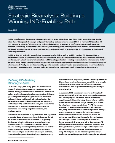 Submitting an Investigational New Drug (IND) application is a pivotal step in the drug development pathway. It provides proof-of-concept and preclinical safety data as it moves toward First-In-Human (FIH) studies. Success requires a strategic bioanalytical approach with clear objectives to deliver reliable human exposure data, target engagement, pathway modulation, early pharmacodynamic (PD) signals, and potential immunogenicity risk assessment.