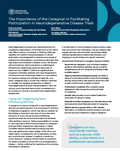 Neurodegenerative diseases entail progressive brain and neuronal deterioration, which often impacts memory, movement, and cognition. With such significant and progressive disability, patients with neurodegenerative disorders become increasingly reliant on a care partner for decision-making and activities of daily life. As a result, caregivers play a crucial role, making it essential to consider the caregiver perspective to support neurodegenerative disease trial participation.