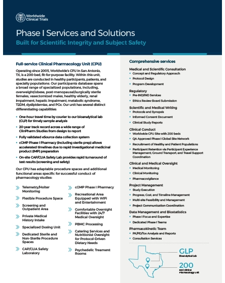 With the ever-increasing complexity of Phase I trials, Worldwide Clinical Trials has you covered. It is our mission to deliver better data, faster, without compromising quality, allowing your asset to accelerate to the next step. Check out our fact sheet that details our comprehensive support services for Phase I trials, our full-service, fit-for-purpose clinical pharmacology unit, pharmacy services, and more.